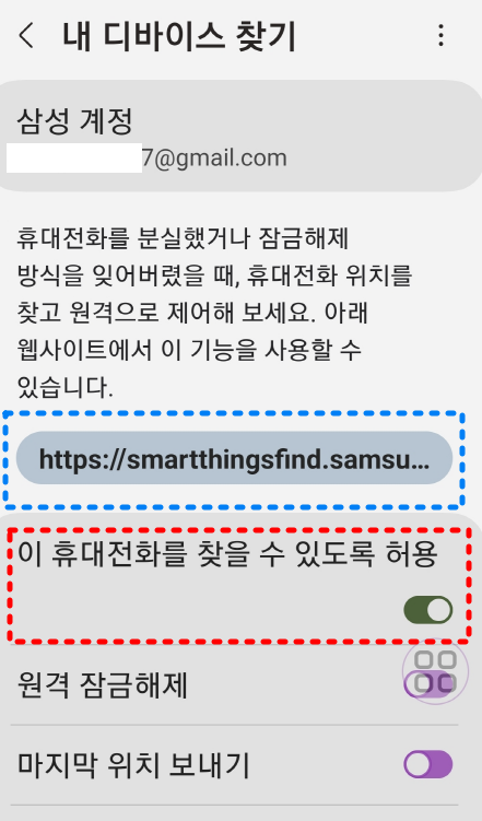 삼성 갤럭시 핸드폰 빨간 점선 사각박스처럼 '휴대전화를 찾을 수 있도록 허용'에 체크하시면 바로 위쪽 파란 점선박스 안에 있는 웹사이트 주소를 손으로 눌러주시면 내 핸드폰의 위치를 확인해 보실 수 있고 오프라인 찾기를 켜 주시면 내 핸드폰 분실한 경우에 다른 기기를 통해 즉 가족 핸드폰이나 지인 핸드폰을 통해서 내 핸드폰의 위치를 찾아보실 수 있는 편리한 기능이 제공됩니다.